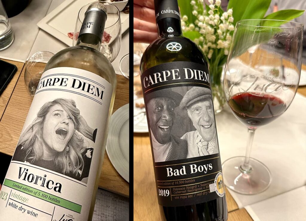 W 2014 roku, gdy pierwszy rocznik win był gotowy do butelkowania zaczęły się prace nad etykietą. Ion Luca zlecił projekt czterem agencjom specjalizującym się w projektowaniu etykiet. Każda przygotowała mu po 5 projektów. Zobaczył 20 różnych koncepcji i żadna mu się nie spodobała – żadna nie była odzwierciedleniem Carpe Diem. Ion chciał czegoś, co przyciągałoby wzrok i niosło przesłanie szczęścia i radości. Po pół roku burzy mózgów skończyły się pomysły, Luca wydał sporo pieniędzy i spóźniał się z wprowadzeniem win na rynek. Był coraz bardziej sfrustrowany. Pewnego dnia na lotnisku w Bukareszcie zobaczył rumuńskie wina z twarzami ludzi na etykietach. Wszystkie były poważne albo smutne. I natychmiast sam poczuł się smutny. On chciał robić wino wesołe, cieszące się życiem. I to był moment, w którym sobie pomyślał: „Chwila. A co jeśli zrobimy to samo, ale ze szczęśliwymi ludźmi?” Gdy wrócił w nocy do domu, ściągnął zdjęcia różnych twarzy z Shutterstock i wysłał je jednemu z projektantów, prosząc, aby stały się one centralnym elementem. Tak zrodziły się etykiety, które wywołują uśmiech na twarzy i przypominają, że warto cieszyć się każdą chwilą i smakować życie. Do każdej kolejnej etykiety Luca wybiera twarz, która najlepiej odzwierciedla osobowość jego wina.