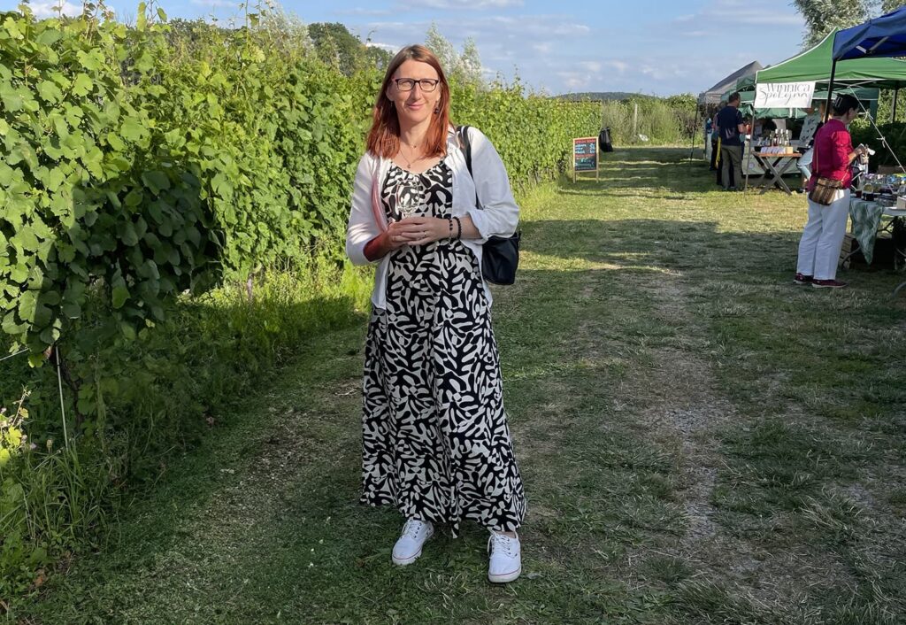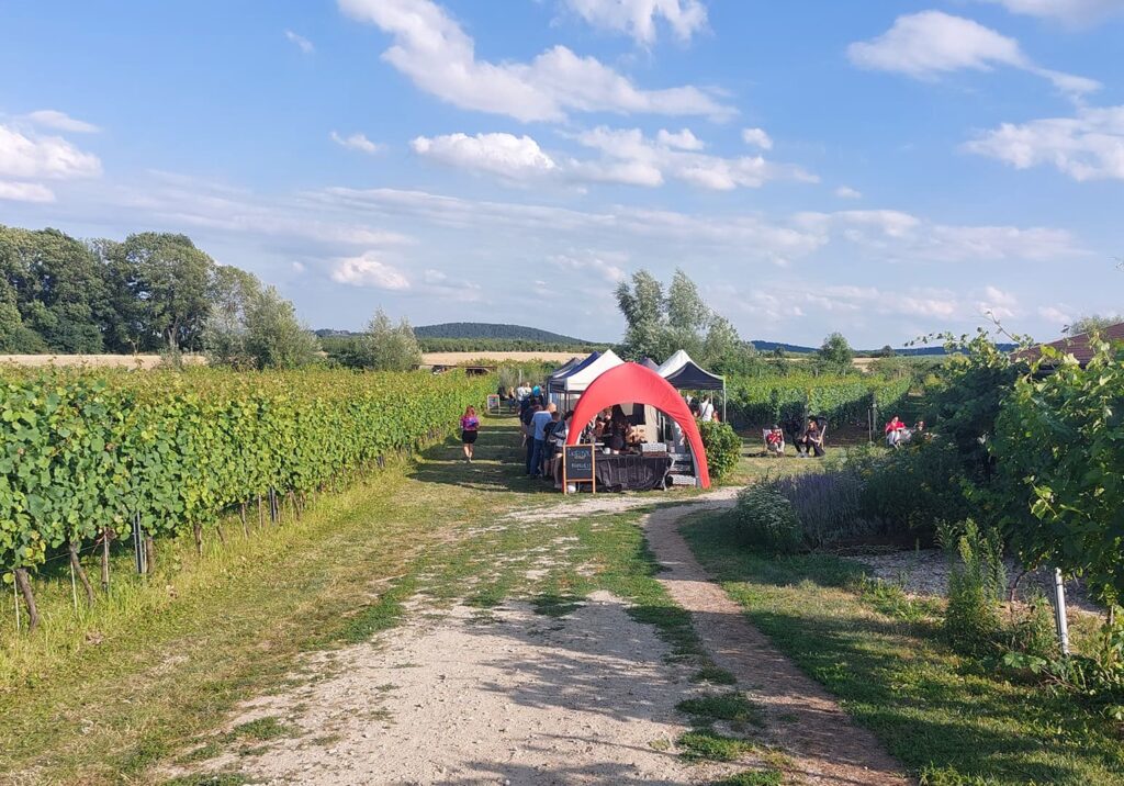 Grupa Winiarze i Przyjaciele zrobiła wydarzenie „Spotkajmy się w winnicy”. Z widokiem na górę Ślężę, w szczerym polu, pomiędzy winoroślami, a kwitnącą kukurydzą – rozstawione namioty, leżaki, stoliczki, przygotowane konkursy i zabawy z winem, zwiedzanie winnicy i stoiska degustacyjne pięciu dolnośląskich winnic. Dowiedziałam się, że w okresie letnim takich spotkań jest kilka – za każdym razem w innej winnicy, z udziałem różnych winiarzy. A w ostatni weekend sierpnia, we Wrocławiu na Torze Wyścigów Konnych Partynice, obywa się wielki finał – Festiwal Winiarze i Przyjaciele – na którym wystawiają się wszyscy winiarze ze Stowarzyszenia Winnic Dolnośląskich – czyli ponad 30 winnic!