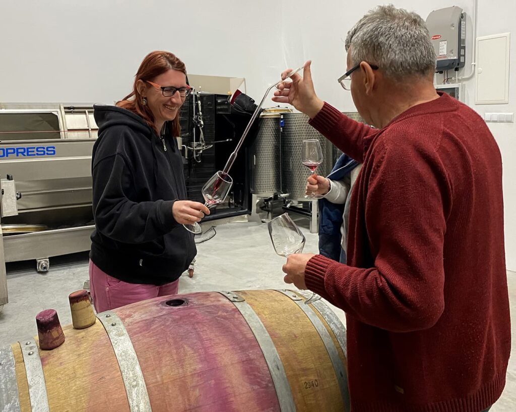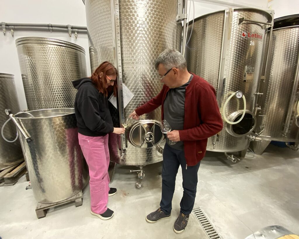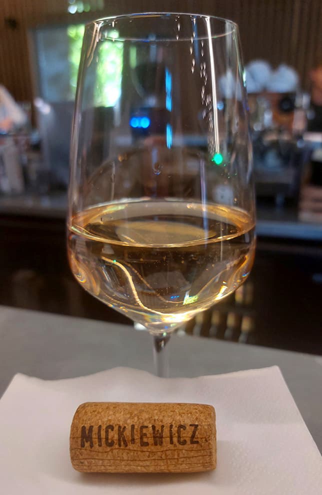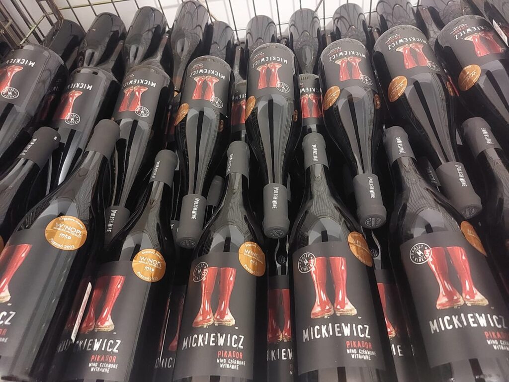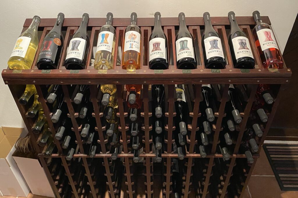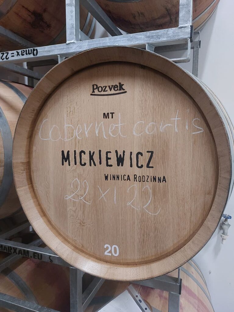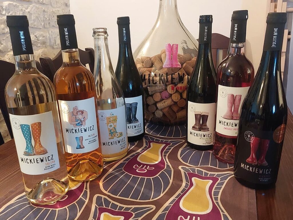 Winnica Mickiewicz. Znajduje się w Opolu Lubelskim. Jej początki sięgają 2004 r. Przyjechaliśmy tu w majówkę, po wcześniejszym umówieniu się. Właściciel Maciek oprowadził nas po starszej części winnicy, opowiedział o krzewach, odmianach, pracy przy nich i radości jaką daje tworzenie wina. Potem poszliśmy próbować trunków. To była degustacja, która przeszła moje najśmielsze oczekiwania. Było tak cudownie, wesoło, profesjonalnie, a jednocześnie luzacko, że moglibyśmy tam siedzieć, słuchać, pić i śmiać się całą noc. Wina rewelacyjne! Spróbowaliśmy 13. Nie tylko tych gotowych, zabutelkowanych. Mieliśmy to szczęście, że mogliśmy spróbować też win prosto z kadzi i beczek. Niezła gratka! Każde kolejne lepsze od poprzedniego. Nieznane dotąd i totalne zaskoczenia to Petnat (z Johanitera) i Pikador (pyszny pikantny zweigelt). A Solaris i Riesling tak dobre, że oba wzięliśmy na wynos. Siedzieliśmy kilka godzin – rozmawialiśmy, żartowaliśmy, piliśmy, zajadaliśmy pyszne kozie sery z mleka od lokalnych kóz, robiliśmy zdjęcia, trochę się wydurnialiśmy i usłyszeliśmy dużo fajnych opowieści – oczywiście szczegółowo wypytaliśmy o historię kaloszy na etykietkach. To było super spotkanie, jedno z tych, które zostają na zawsze w głowie i w sercu. Jestem pewna, że jeszcze tam wrócę.