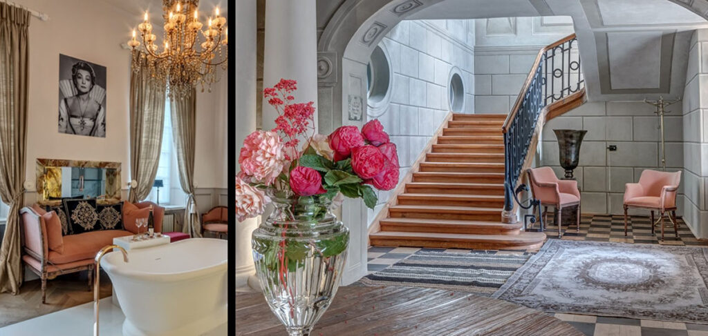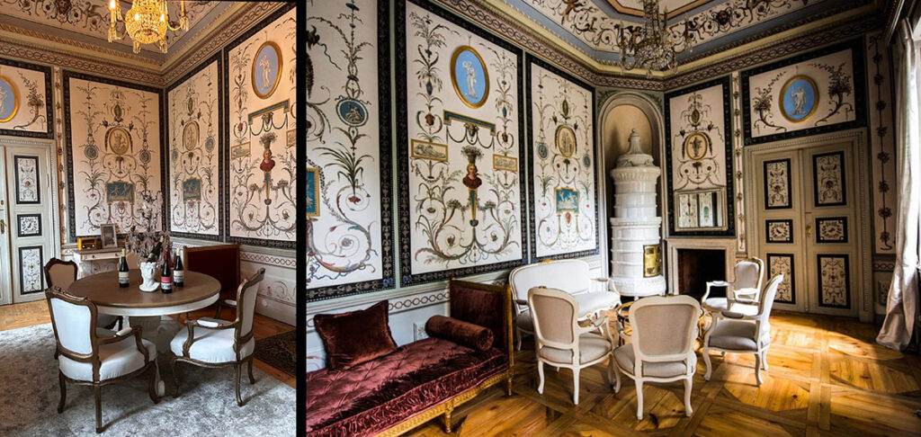 Bardzo polecam też zwiedzanie pałacu, który ma naprawdę niezwykłą historię. Był zbudowany przez Bazylego Walickiego – doradcę i współpracownika króla Stanisława Augusta Poniatowskiego, który nie raz tu gościł. Później należał do rodzin Lubomirskich i Morawskich. Po II wojnie światowej stał się letnią siedzibą premiera Józefa Cyrankiewicza, potem bardzo zniszczał, bo pałacowe salony zamieniono w Instytut Ziemniaka. W 2011 roku majątek kupili państwo Barańscy, a jego renowacja zajęła kilka lat.