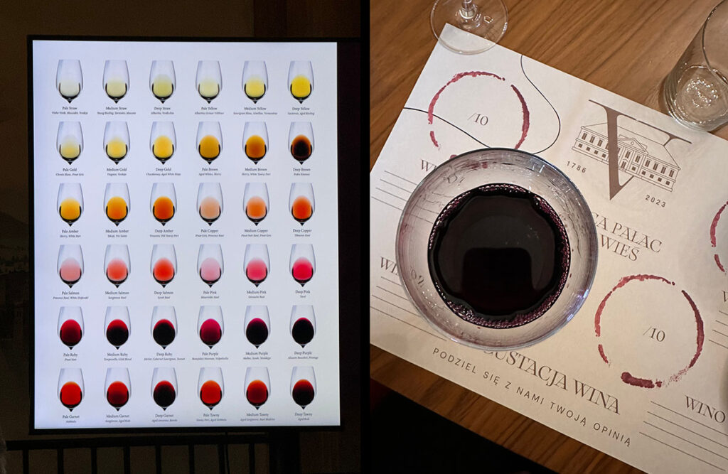 • Wzrok: nasz główny zmysł, jednocześnie ten, który może nas najbardziej oszukać. Tu przede wszystkim liczy się kolor. Im więcej wiemy o winie, tym więcej mówi nam o nim jego kolor. Ale oprócz koloru oceniamy także klarowność, mętność, lepkość (łzy na kieliszku), musowanie i kształt bąbelków, to czy jest osad.