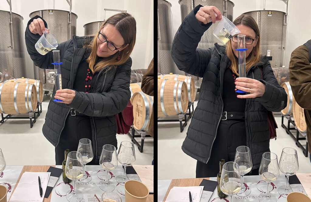 Na stołach czekały na nas menzurki, miarki, naleweczki – odmierzaliśmy, zapisywaliśmy, przeliczaliśmy, mieszaliśmy…. Czasem trzeba było zredukować intensywność beczki, czasem zwiększyć kwasowość, a finalnie znaleźć równowagę między owocowością a beczką i kwasowością a nutami maślanymi. Na koniec dostaliśmy buteleczki i każdy mógł zabrać ze sobą swoje niepowtarzalne Chardo! Cudowna zabawa, mnóstwo wiedzy organoleptycznej.