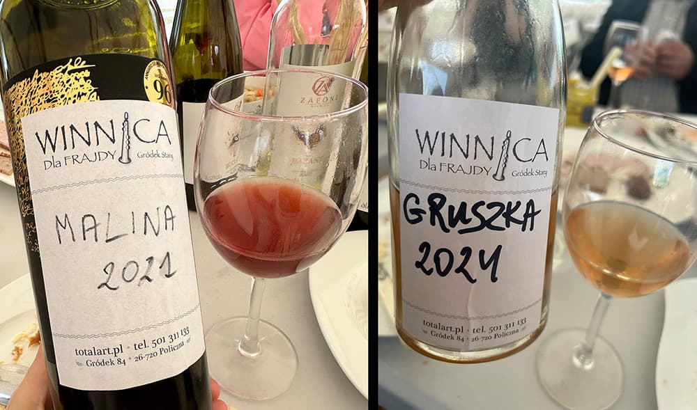 Ale to nie koniec! Naszymi współtowarzyszami na tej degustacji byli dwaj winiarze, którzy przywieźli swoje wina i dzięki temu mieliśmy okazję spróbować Wina od Adama – różowego, leciutko musującego, gdzie druga fermentacja była w butelce, na zamrożonych gronach oraz dwóch win owocowych: Malinowego i Gruszkowego z Winnicy dla Frajdy. To było super spotkanie!