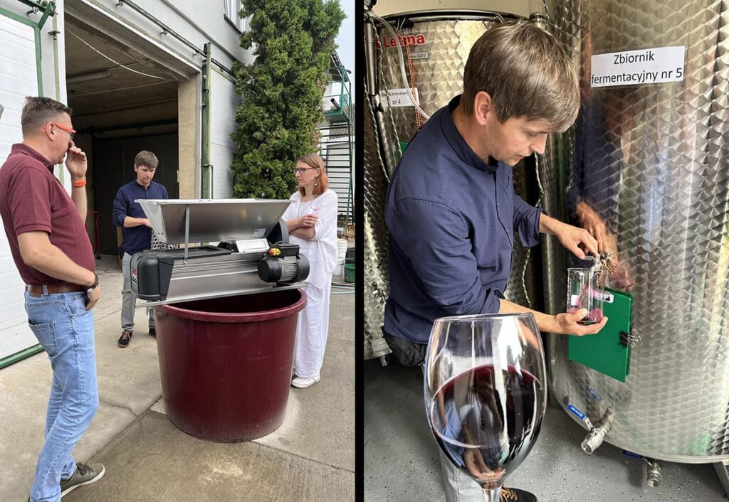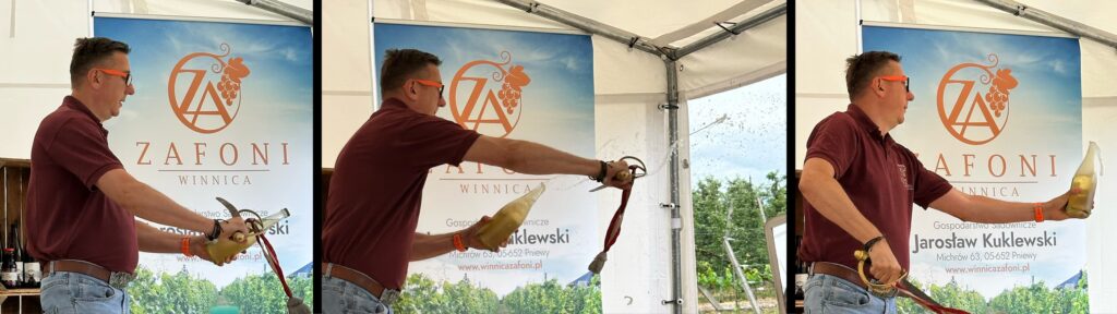 Degustacja zaczęła się od pokazu Sabrage. Było dużo pysznego jedzenia i aż 12 win: 5 z Białego Kruka i 7 z Zafoni. Ale to nie wszystko! W przerwie poszliśmy do przetwórni, obejrzeliśmy maszyny i spróbowaliśmy 3 win prosto ze zbiornika z rocznika 2023: Regenta i dwóch wersji Monarcha – jednej słodszej, która jest samociekiem i drugiej – bardziej wytrawnej. Zapowiada się świetny blend tych dwóch win! I te kolory!