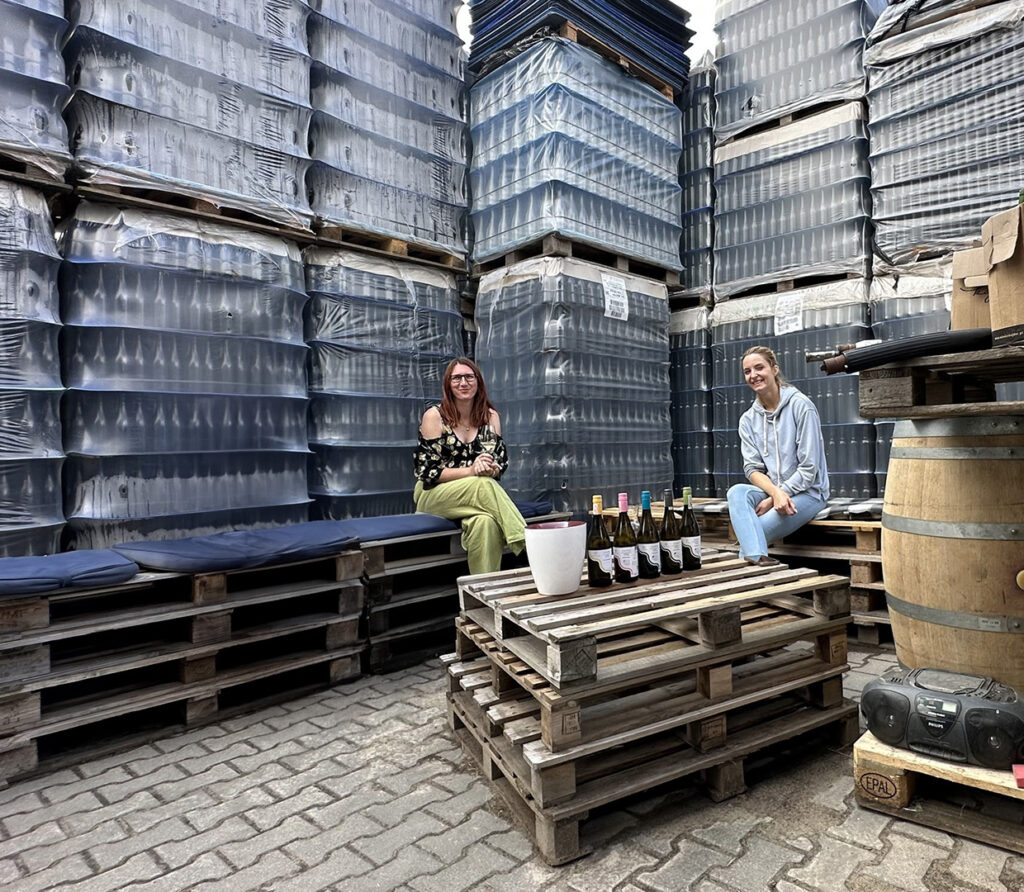 Winnica jest piękna! Na 8 ha uprawiają 8 szczepów: 5 odmian białych (które stanowią 70%) i 3 czerwone. A degustacja była inna niż wszystkie – siedzieliśmy sobie na paletach, wśród butelek, na świeżym powietrzu, delektując się widokami i smakami. A smaki świetne! Winnica znajduje się tuż obok Puszczy Bukowej, która rośnie na górach wapiennych, a to bez wątpienia wpływa na mineralny charakter win. Spróbowaliśmy sześciu. Wszystkie dały nam dużo radości. Odkryć i ciekawostek było mnóstwo, ale jako amatorka niezwykłych kupaży napiszę o najciekawszym: jeden szczep – Cabernet Cortis, ale za to blend z 5 roczników: 2018-2019-2020-2021-2022. Na zdjęciu go nie ma, bo nie było jeszcze zaetykietowane. Ale teraz już jest w kolekcji i ma etykietę w pięknej czerwieni.
