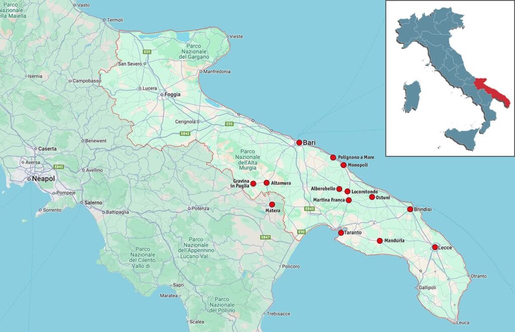 Byłam w Apulii 3 razy i jestem pewna, że wrócę tam jeszcze nie raz. Za każdym razem lądujemy w Bari – bilety lotnicze są wyjątkowo tanie (lot z Okęcia potrafi kosztować 40-60 zł). Każda wyprawa to inne miasteczka i inny rodzaj przemieszczania. Raz wypożyczyliśmy samochód (niedroga opcja, polecam szczególnie na wypad w 4 osoby), a dwa razy przemieszczaliśmy się pociągami i lokalnymi autobusami (świetna alternatywa, szczególnie jeśli chce się odwiedzić te większe, dobrze skomunikowane miasta).