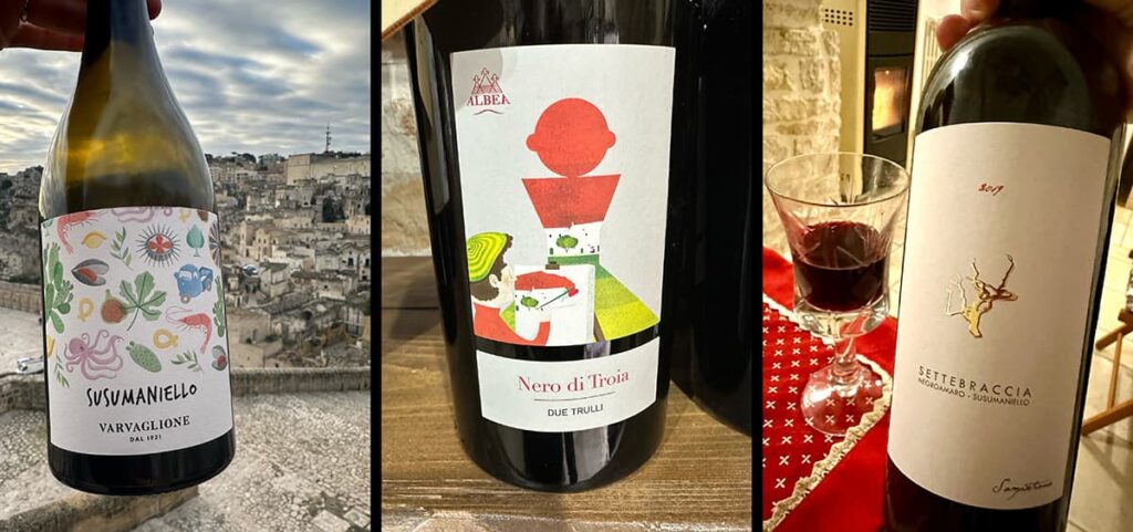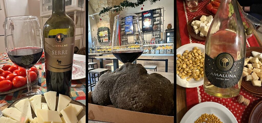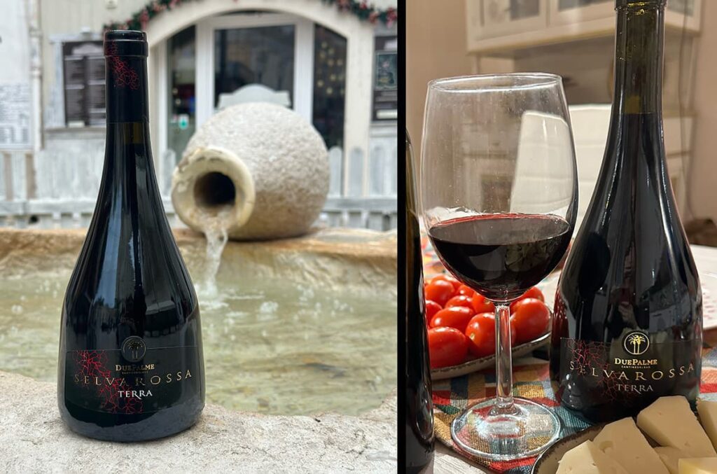Przy czerwonych szczepach nie sposób nie wspomnieć, że z większości z nich Włosi robią także wina różowe, a niekiedy nawet białe (w Alberobello piliśmy białe, musujące Negroamaro). Natomiast wino, które zrobiło na mnie największe wrażenie, to Selvarossa Terra od Due Palme – blend Negroamaro i Malvasia Nera. Bardzo intensywne, aksamitne, pełne aromatów skóry, tytoniu, beczki, dżemu śliwkowego, a nawet suszonych śliwek. Część winogron był podsuszana. To wino, któremu dałam najwyższą ocenę na Vivino. Kupione w Brindissi, a wypite w Lecce sprawiło, Apulia na dobre zamieszkała w moim sercu.